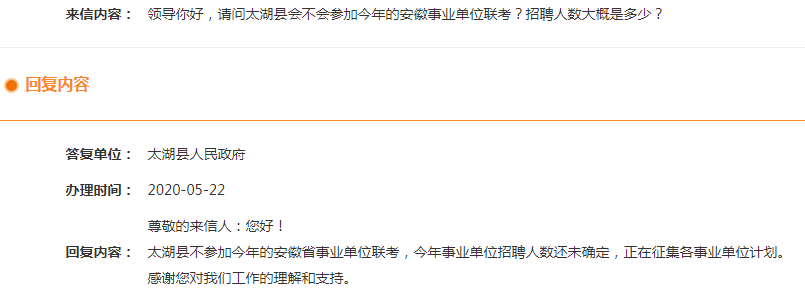 來(lái)信內(nèi)容:領(lǐng)導(dǎo)你好,請(qǐng)問(wèn)太湖縣會(huì)不會(huì)參加今年的安徽事業(yè)單位聯(lián)考?招聘人數(shù)大概是多少?